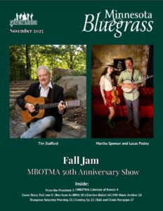 Print copies of Minnesota Bluegrass Magazine are mailed by the 25th of the month to MBOTMA members. To become a member, please refer to the information on our membership page. If you are already a member and want to receive Minnesota Bluegrass in electronic form instead of by postal mail, or you have problems opening the file, please email the Minnesota Bluegrass editor